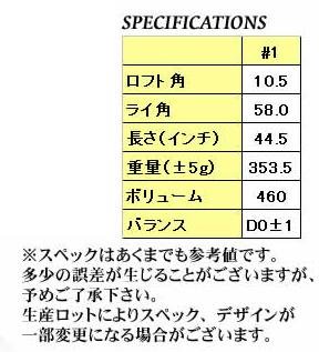 ロフト角10.5°、ライ角58°、長さ44.5インチ、重量353.5g、ボリューム460cc、バランスD0±1ドライバーは2008年SLEルール適合 公式競技での使用も可能です